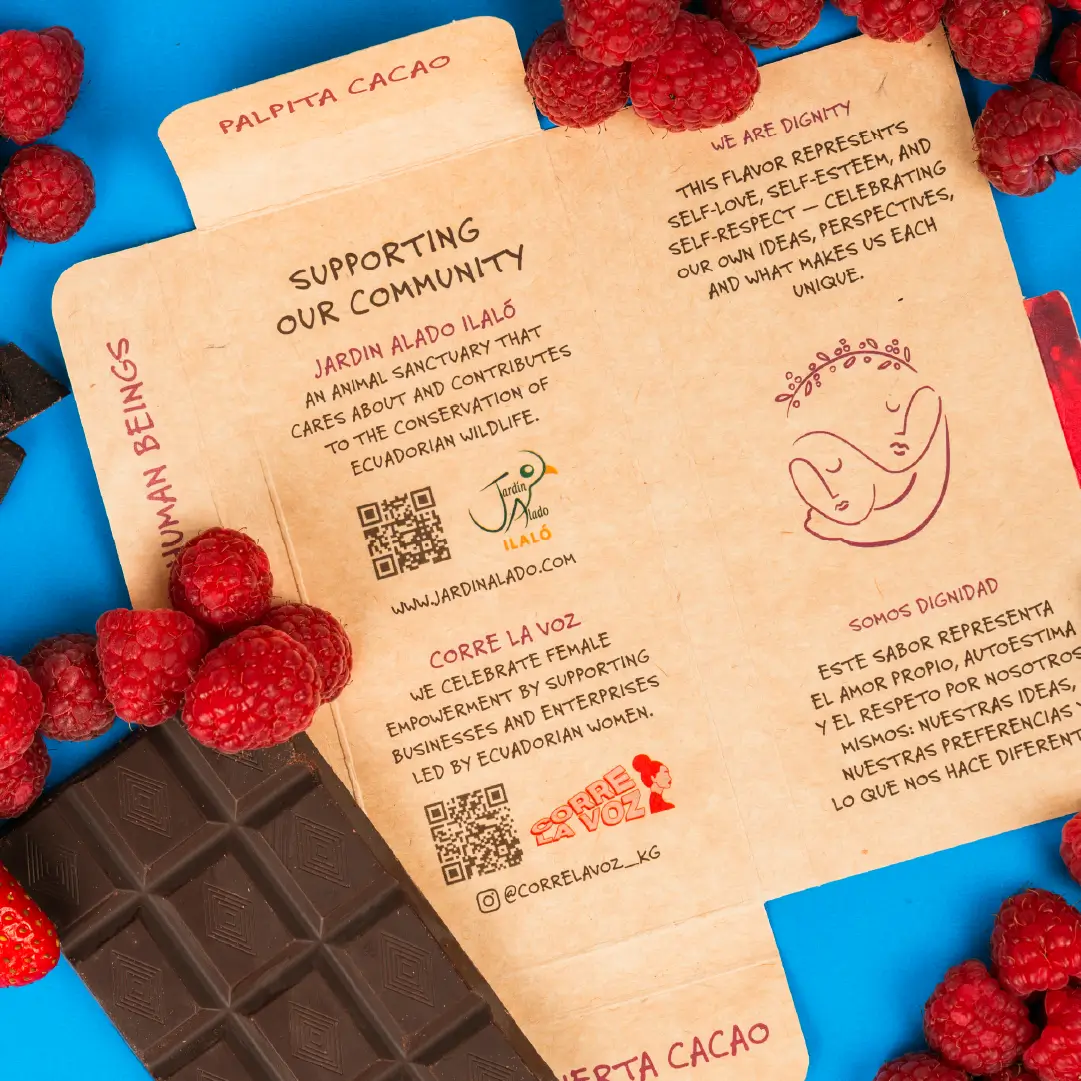Cora es un chocolate 100% ecuatoriano que celebra los sabores, costumbres y tradiciones de nuestro país. Más allá de su delicioso producto, Cora representa al corazón: un símbolo de amor por la vida, por las causas sociales y por la tierra. Gran parte de sus fondos proviene de empresas aliadas comprometidas con generar un impacto social y ambiental positivo.